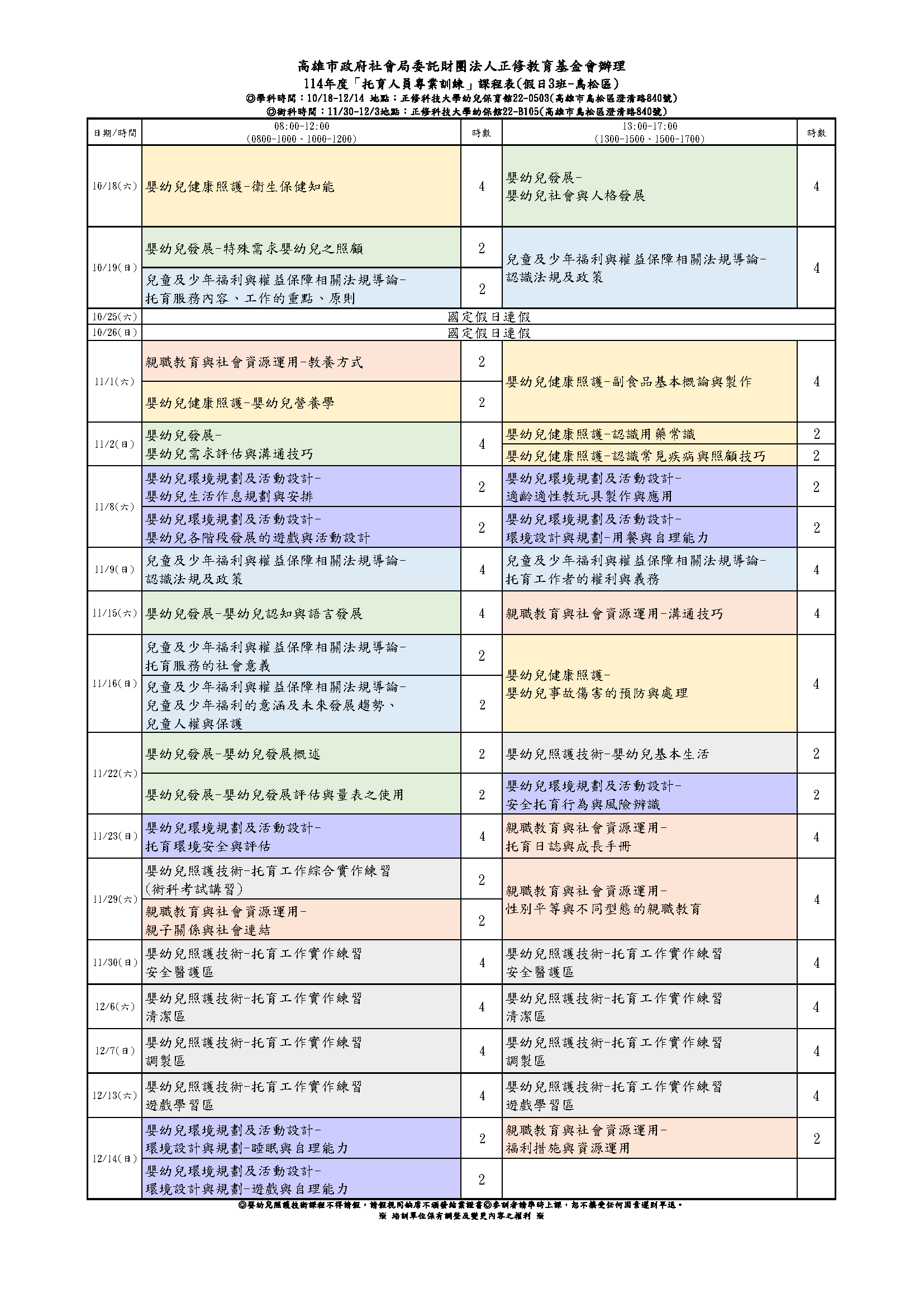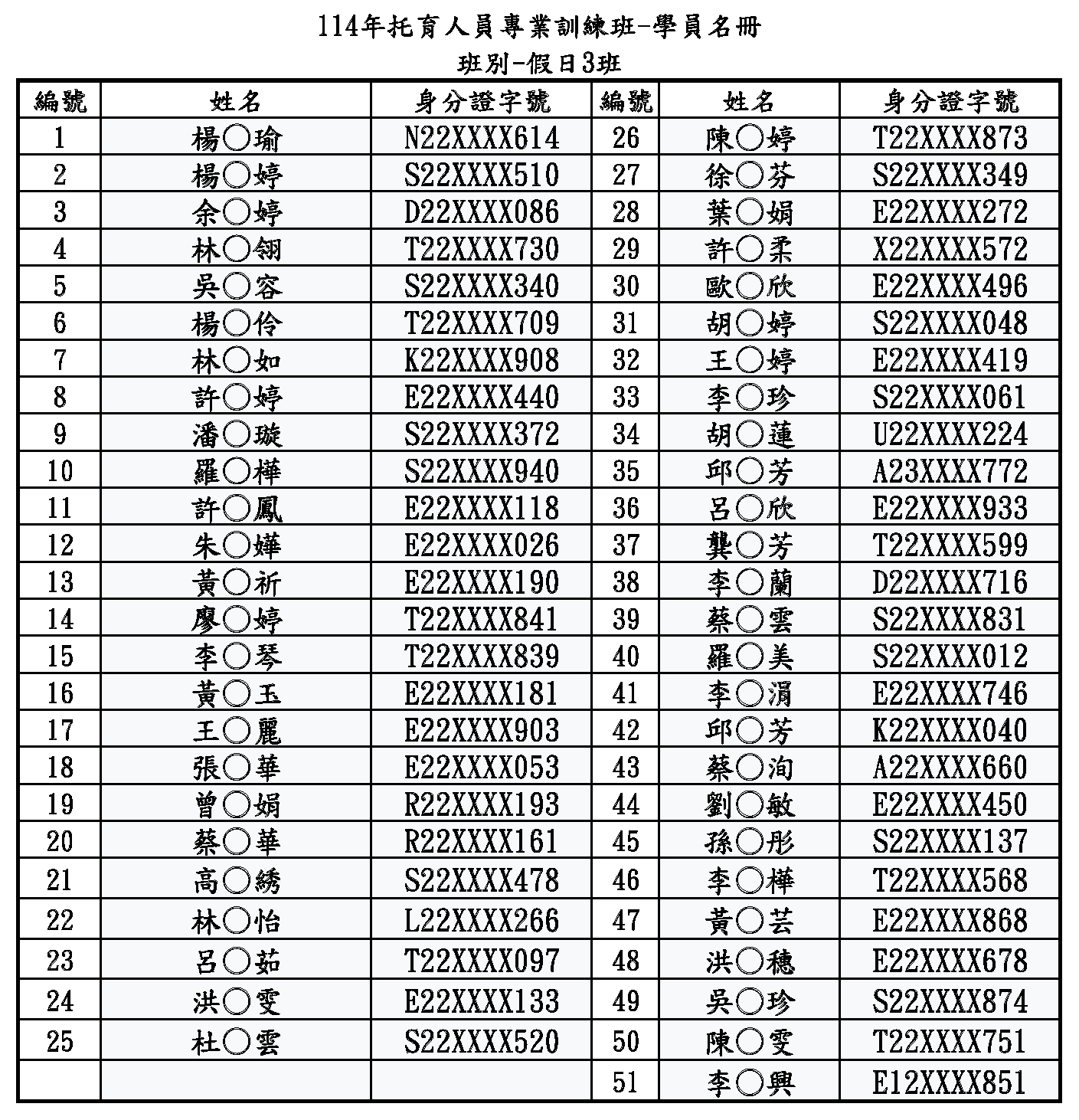 114年托育人員專業訓練假日3班「參訓學員名單」及「上課須知」
