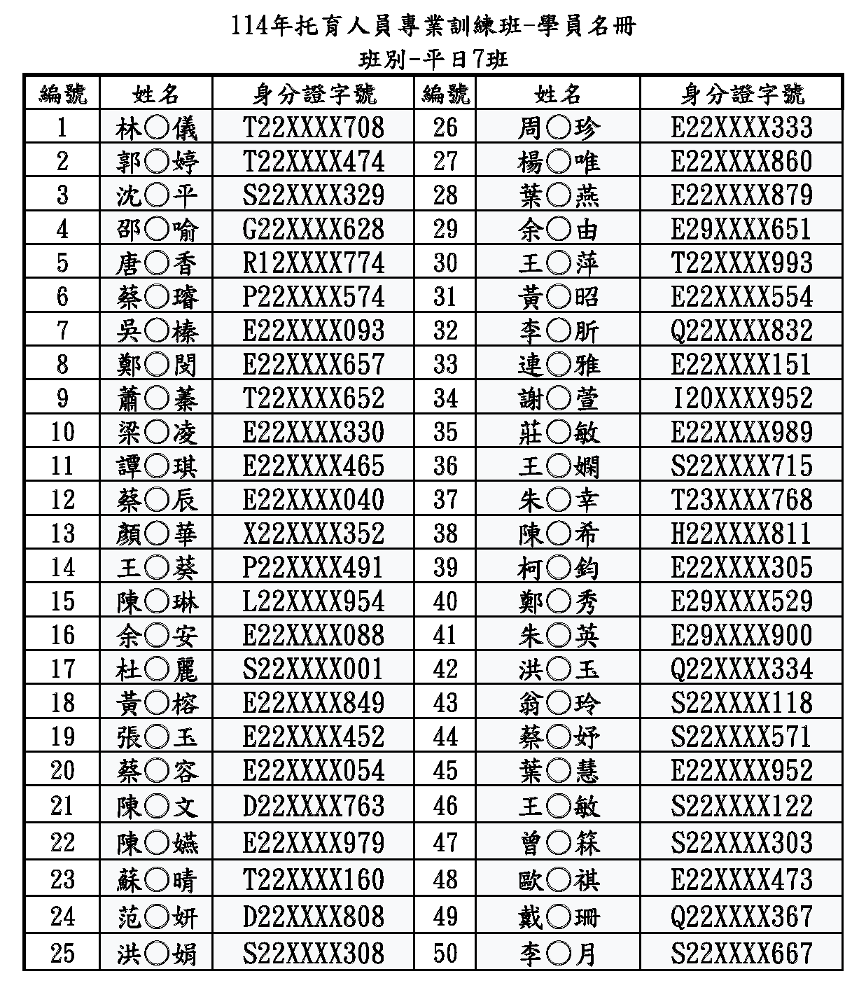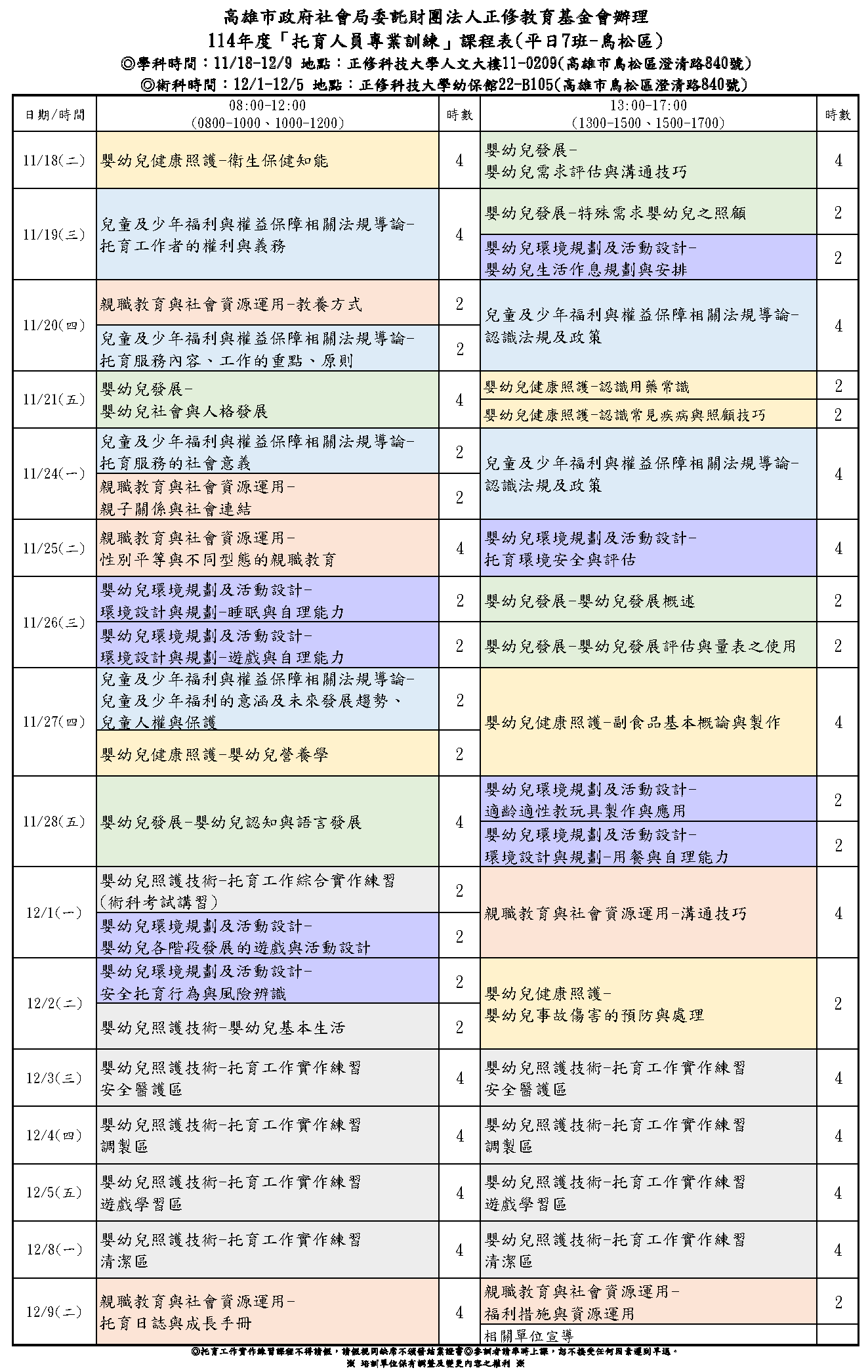 114年度托育人員專業訓練平日7班將於11/18(二)開始上課(上課時間 : 8:00-17:00;上課地點 : 正修科技大學人文大樓2樓209教室),當日上課我們將講解課程規定及幫大家申請停車證(請攜帶200元押金)。請各位學員提前20分鐘報到。歡迎大家來上課~期待相會!
