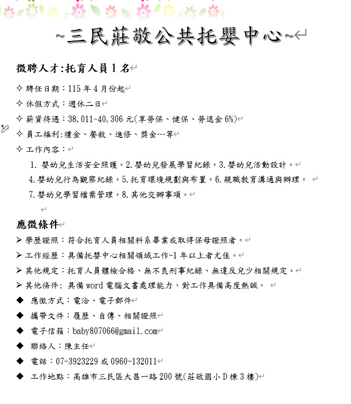 高雄市三民莊敬公共托嬰中心徵才