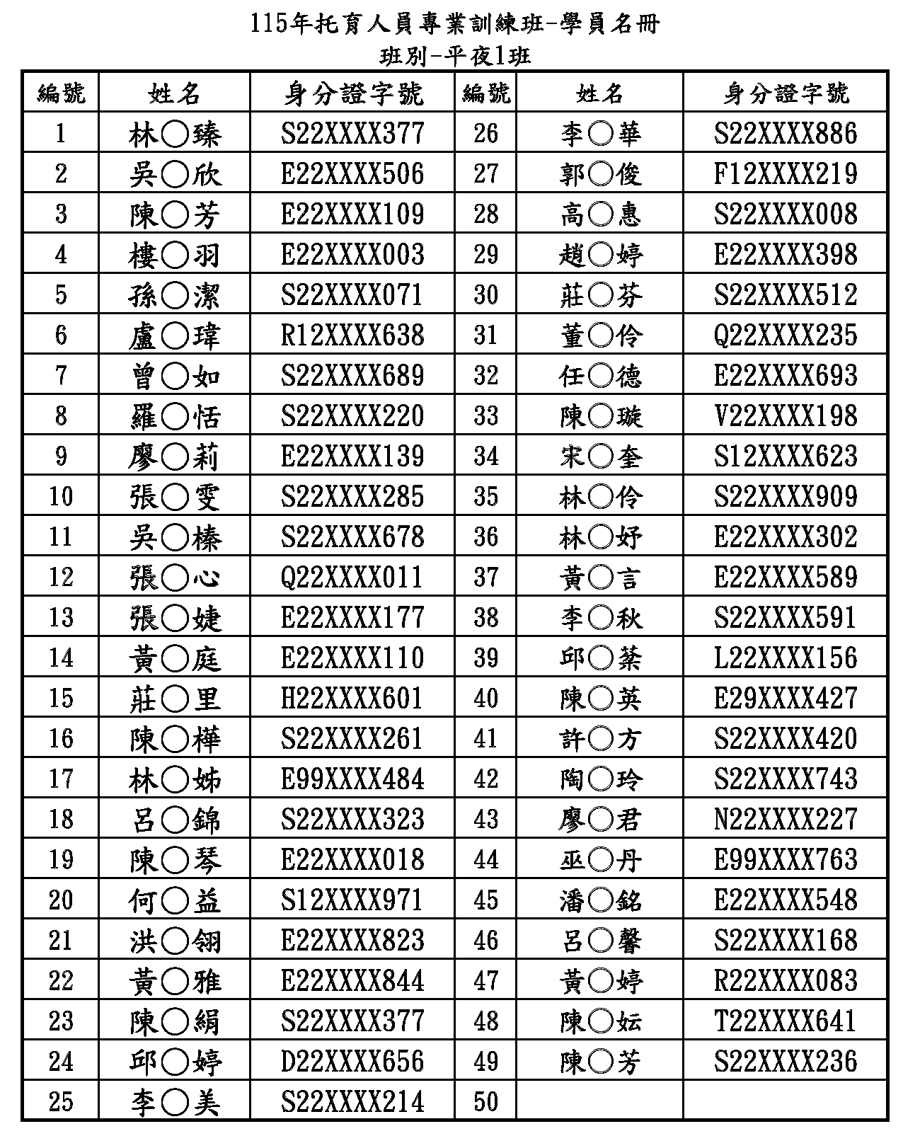 115年托育人員專業訓練平夜1班「參訓學員名單」及「上課須知」